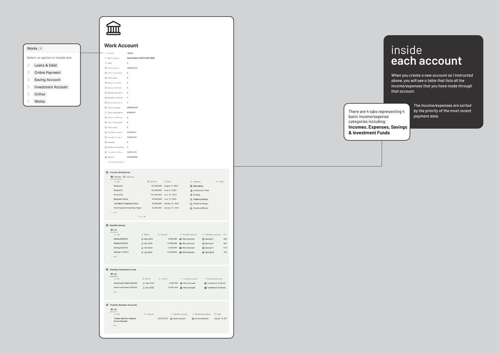 - "Harvest & Sowing Categories" summarizes and divides your income and expenses in life into different categories so that you can know which category brings you the most profit and vice versa, from which you can change and update your financial plan. Under each category, all the listed income or expense items belonging to that category will be listed. The data you update each month will automatically be sorted here through Notion's data linking function, which you don't need to update manually.