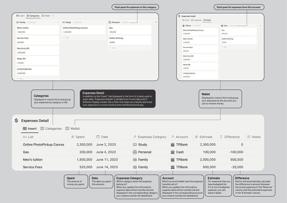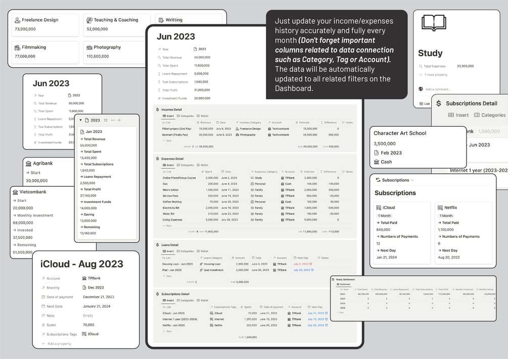 - Just update your income and expense history accurately and fully each month (don't forget the important columns related to data connection such as Category, Tag, or Account), data will be automatically updated to all related filters on the Dashboard.