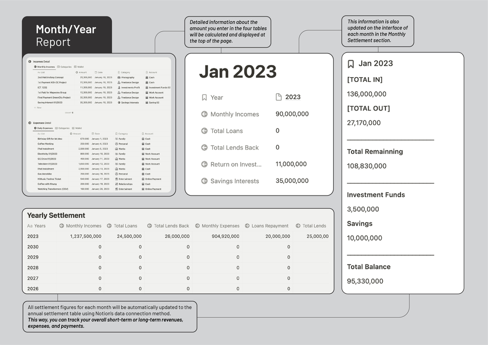 - Yearly Settlement: All settlement data for each month will be automatically updated to the year-end settlement table through Notion's data connection method. This way, you can track your overall income, expenses, and payments in the short or long term.