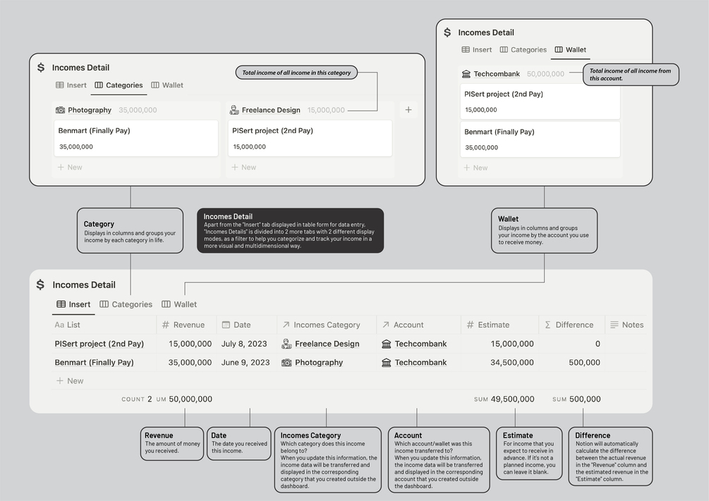 - “Harvest & Sowing Categories” tổng hợp và phân chia thu nhập cũng như các khoản chi phí của bạn trong cuộc sống thành các danh mục khác nhau để bạn có thể biết được danh mục nào mang lại lợi nhuận cho bạn nhiều nhất và ngược lại, từ đó bạn có thể thay đổi và cập nhật kế hoạch tài chính một cách hợp lý. Ở trong từng hạng mục sẽ liệt kê tất cả danh sách thu hoặc chi thuộc hạng mục đó. Dữ liệu mà bạn cập nhật trong từng tháng sẽ tự động được sắp xếp vào đây thông qua chức năng liên kết dữ liệu của Notion mà bạn không cần phải cập nhật thủ công.