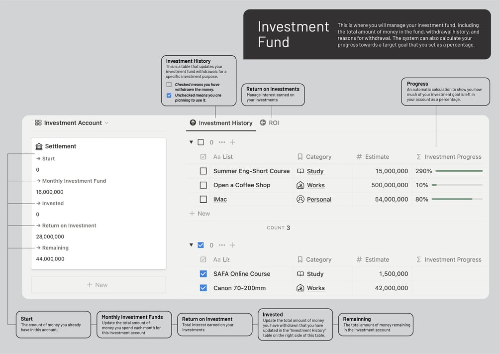 - Investment Account: This is where you will manage your investment fund, including the total amount in the fund, the history of fund withdrawals, and the reason for the withdrawals. The system can also calculate your progress to meet a specific goal you set as a percentage.