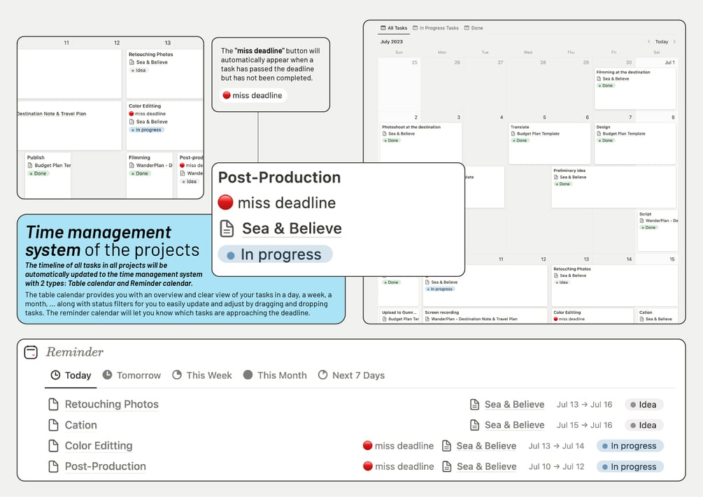 The Spreadsheet will give you an overview and clear view of your tasks in a day, a week, a month,... with status filters to easily update and adjust by dragging tasks. The Reminder Calendar will let you know which tasks are approaching the deadline.