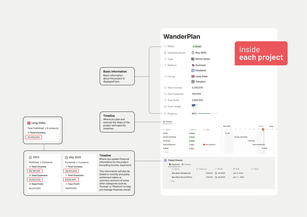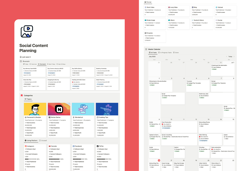 This is a Notion Template that I created to support content creators in planning and managing their diverse items. With this template, you can easily manage your topics, platforms, and content formats in a clear and synchronized way through Notion's data linkage system. The time and financial management systems of each project will also support you a lot in setting goals, vision for short-term and long-term plans.