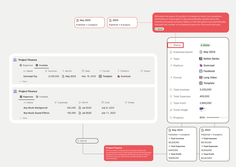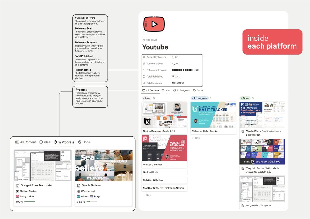 Đây là một Notion Template mà tôi tạo ra để hỗ trợ những người sáng tạo nội dung trong việc lên kế hoạch và quản lý các hạng mục đa dạng của mình. Với template này, bạn có thể dễ dàng quản lý các chủ đề, nền tảng, cũng như các định dạng của nội dung một cách rõ ràng và đồng bộ bằng hệ thống liên kết dữ liệu của Notion. Hệ thống quản lý thời gian và tài chính của từng dự án cũng sẽ hỗ trợ bạn rất nhiều trong việc đặt mục tiêu, tầm nhìn cho các kế hoạch ngắn hạn cũng như dài hạn.